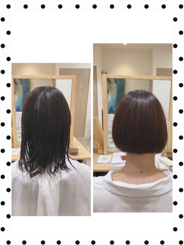肩下の長さから、ばっさりとアゴらいんのワンレンボブにさせて頂きました〜☺️