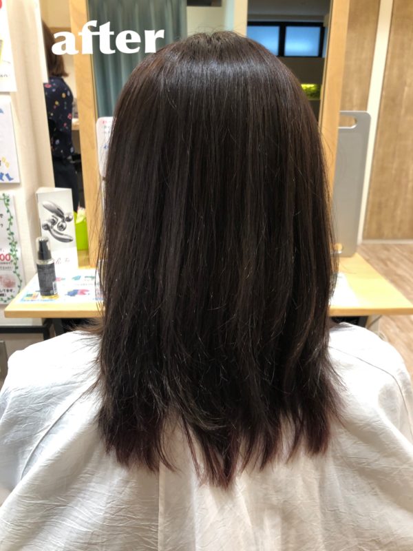 頻繁にカラーできない、とのことでしたので暗めのカラーに仕上げました。いつも明るめのカラーが多く暗めのカラーは物足りない、ということもあり赤のインナーカラーを入れて遊び心をもたせました。