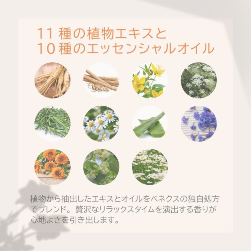 植物から抽出したエキスとオイルをベネクスの独自処方でブレンド。贅沢なリラックスタイムを演出する香りが心地よさを引き出します。