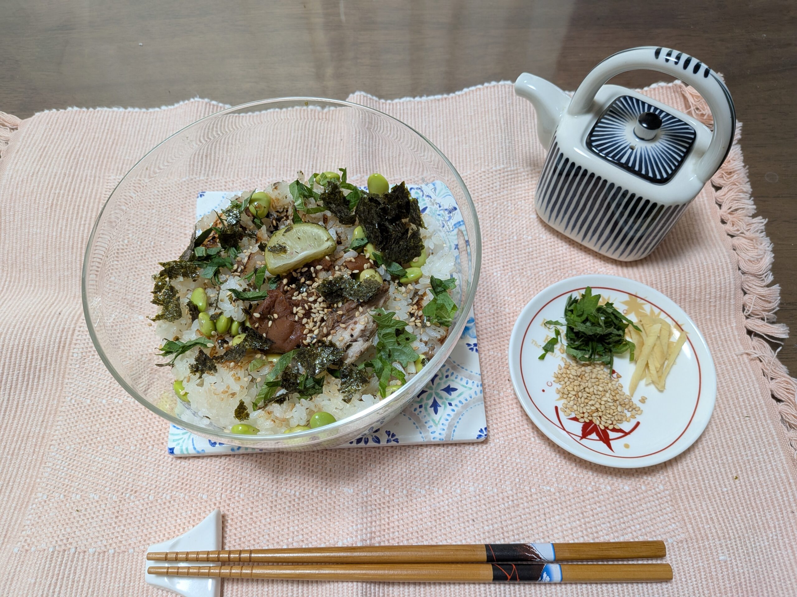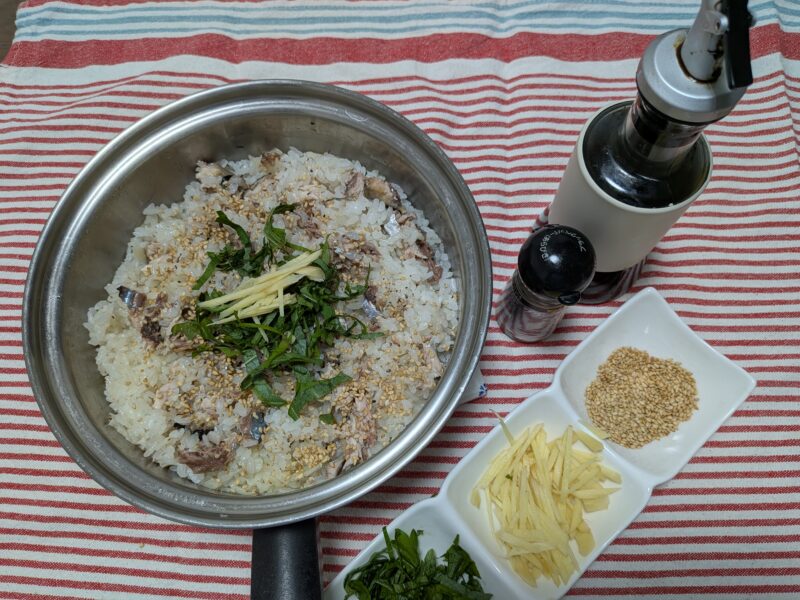 炊きあがってお好みで大葉、生姜、黒こしょう、白ごまをトッピング!