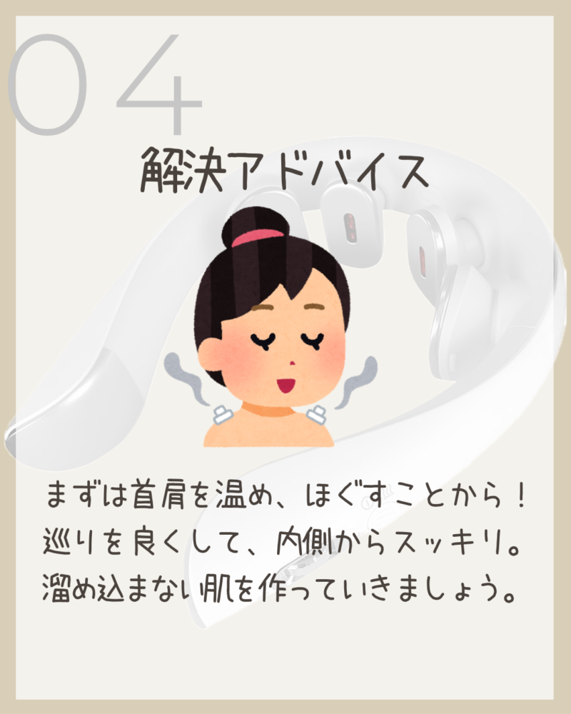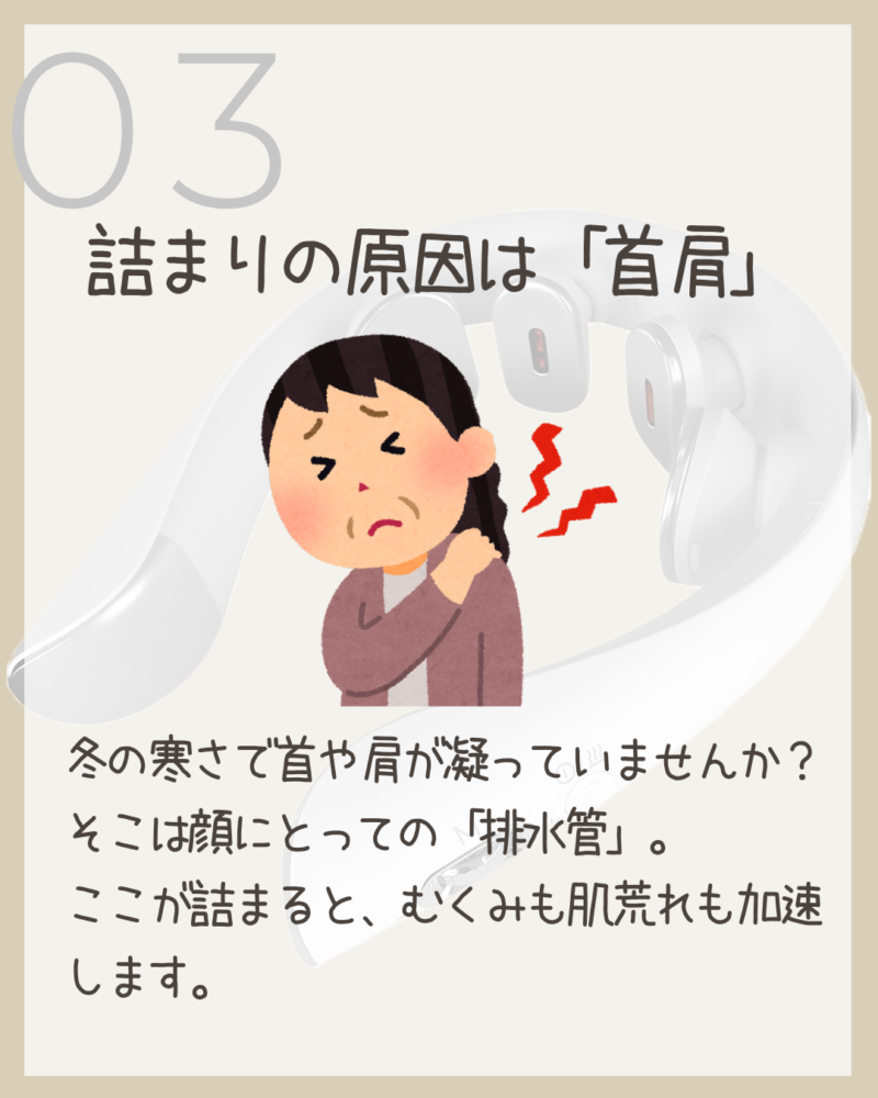 身体の排水管である首や肩がガチガチだと、行き場をなくした老廃物がトラブルとして現れてしまいます。