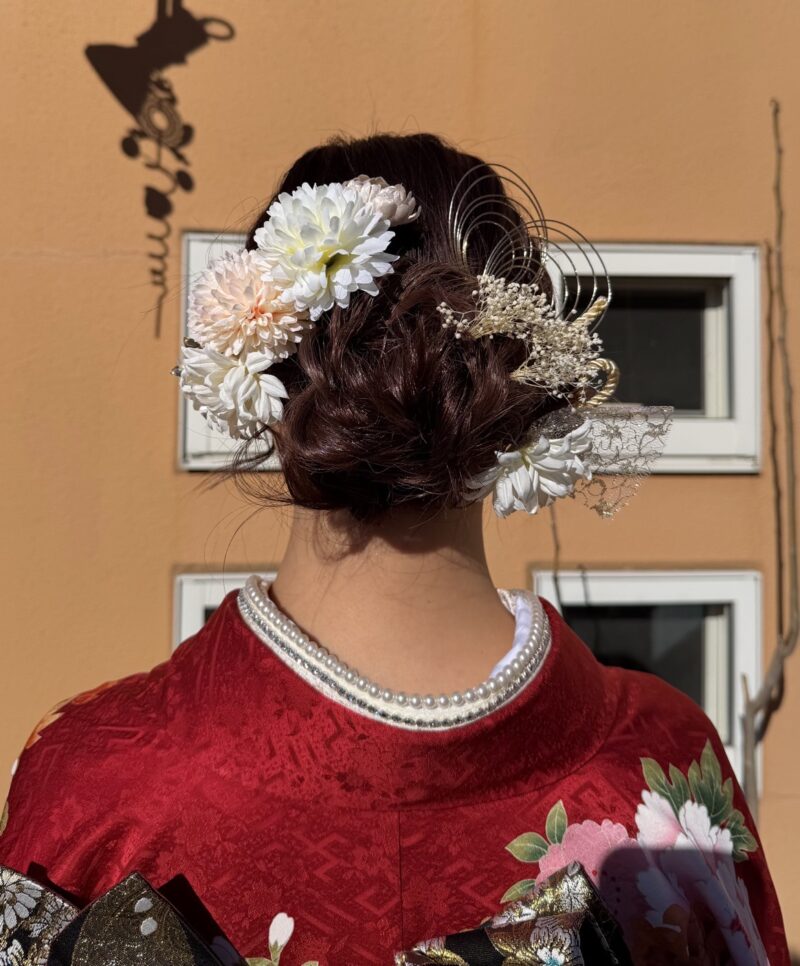 トップはボリューム抑えて下の方に三つ編みと捻りながら毛束を引き出したスタイルになります。