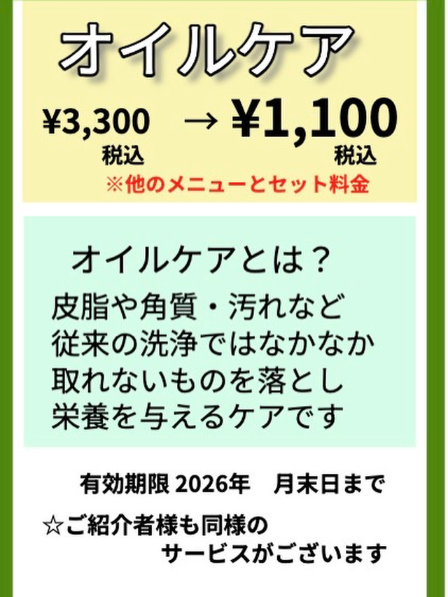 内容はdecoにはじめてご来店のお客様でコチラのカードお持ち頂くと通常3300円のオイルを使ったケアが1100円になります。