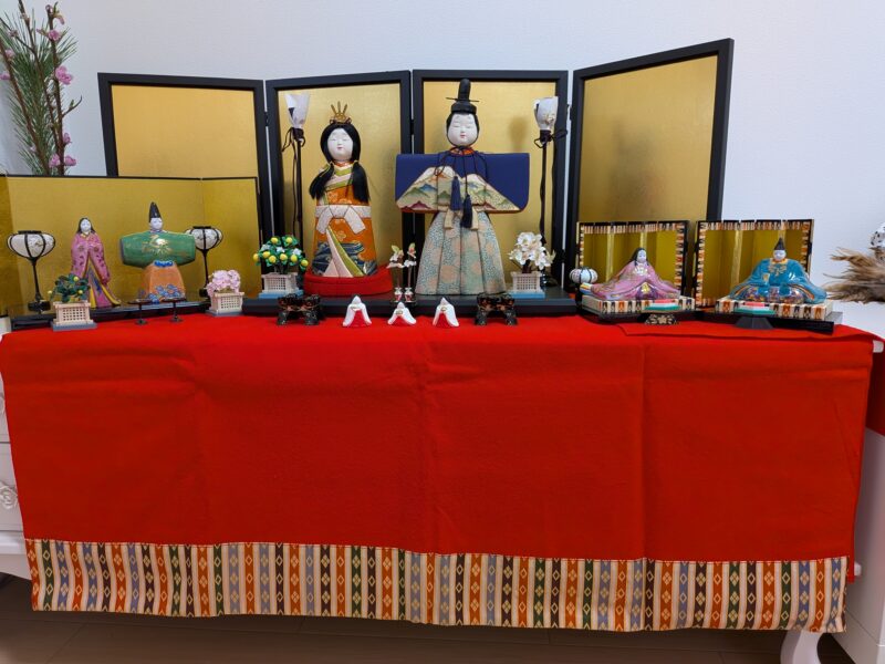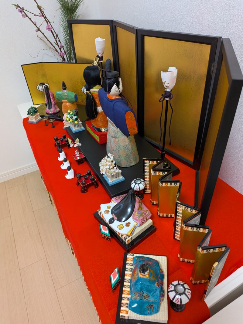 あわてて我が家のお雛様を箱からだして飾りました。真ん中の木目込みの親王飾りは娘の初節句にプレゼントしてもらいました。