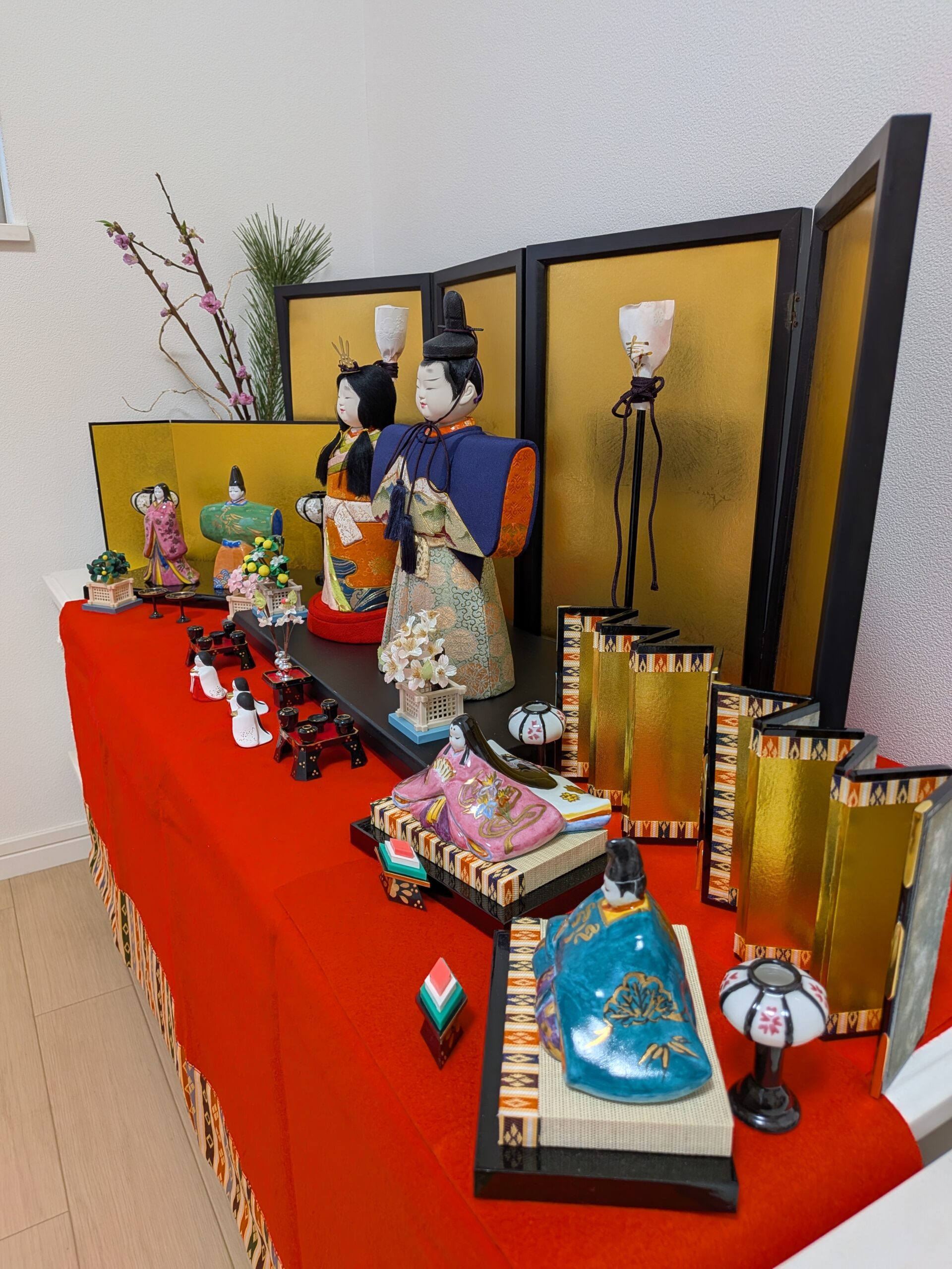 あわてて我が家のお雛様を箱からだして飾りました。真ん中の木目込みの親王飾りは娘の初節句にプレゼントしてもらいました。