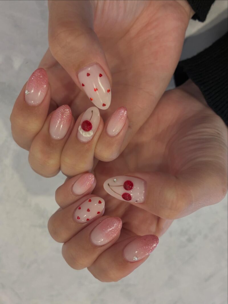 春になると桜のデザインが大人気ですが、お客様がお持ちいただいたさくらんぼのネイルがとても可愛かったです❗️