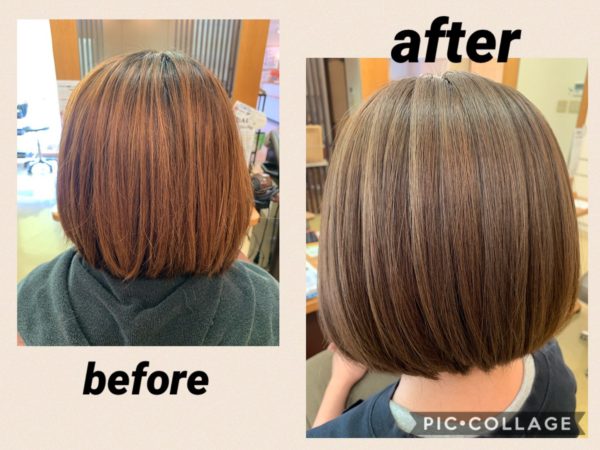もともとの髪の毛の色がオレンジ味が強いお客様にも補色を混ぜたりして、きれいなベージュカラーになりますよ☺︎