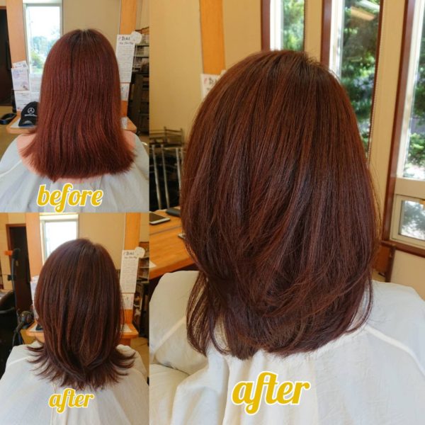 カラーも毛先まで繰り返しお薬を塗っていたということでかなり傷んでいましたが、カットとトリートメントでご覧の通り。